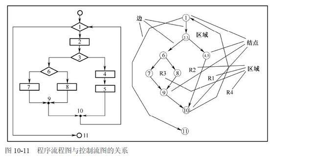 在选择或多分支结构中,分支的汇聚处应有一个汇聚结点。边和结点圈定的区域叫做区域,当对区域计数时,图形外的区域也应记为一个区域。如果判断中的条件表达式是由一个或多个逻辑运算符(OR、AND、NAND、NOR)连接的复合条件表达式,则需要改为一系列只有单条件的嵌套的判断。如图10-11 所示为程序流程图与控制流图的关系。