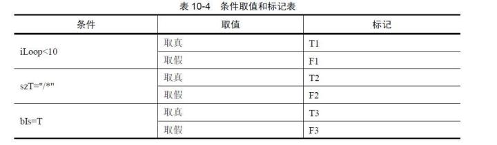 首先将程序中每个分支中的条件取值情况列出来,如图10-8 所示的程序流程图,各分支条件取值和标记见表10-4。