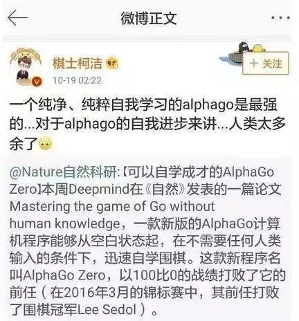 柯洁在与阿尔法狗对决之后,也说出了“人类太多余”这样的话。