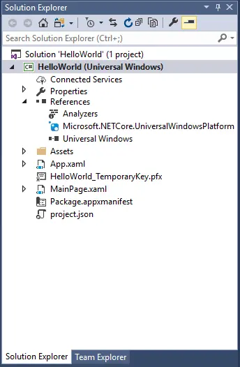 尽管Blank APP(Universal Windows)为最基本的模板,但该模板仍包含很多文件。这些文件是使用C#的所有UWP应用必不可少的文件。在Visual Studio中创建的每一个项目都包含这些文件。