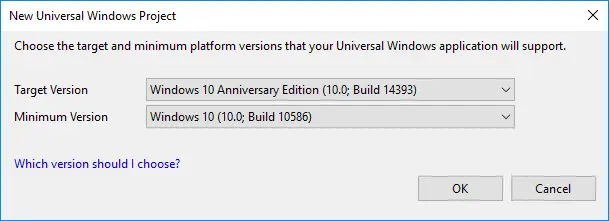 - 将显示Target Version/Minimum Version对话框,默认设置均适用于本教程,因此选择OK以创建项目。