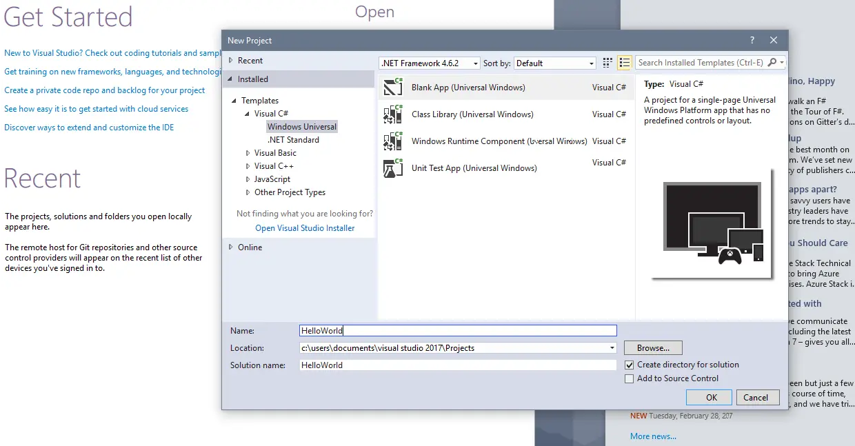 - 选择Blank APP(Universal Windows)模板,输入“Hello World”作为名称,确定。
