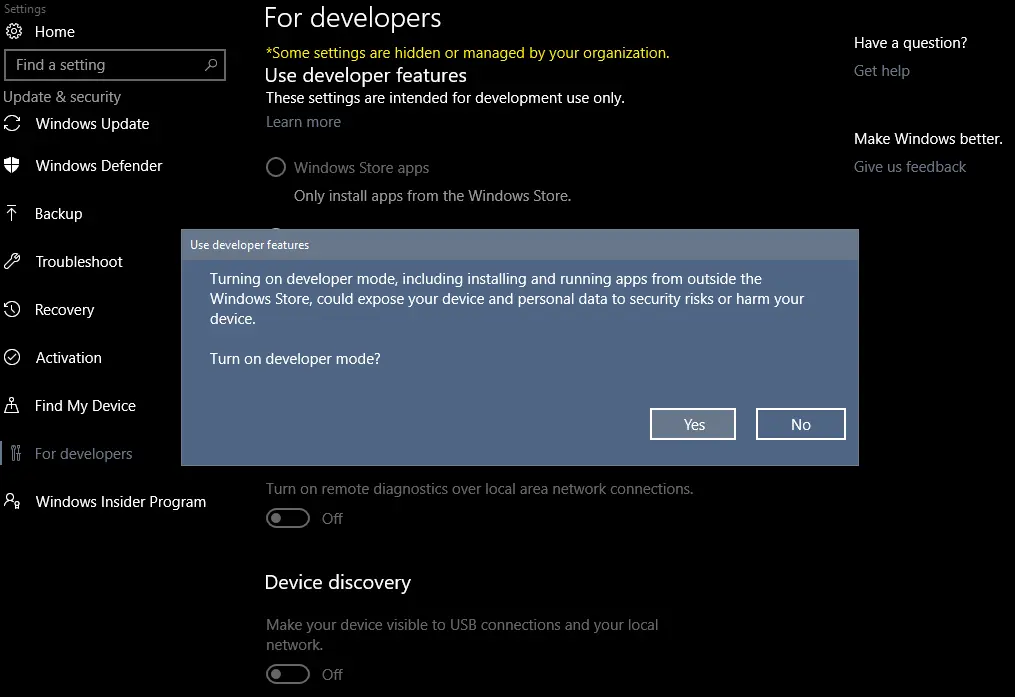 如果你是首次使用Visual Studio,则可能会看到要求启用Developer Mode的设置对话框。开发人员模式是一种用于启用某些功能,如允许直接运行应用而不是从应用商店运行的特殊设置。这里需要选择Developer Mode,然后点击OK并关闭对话框。