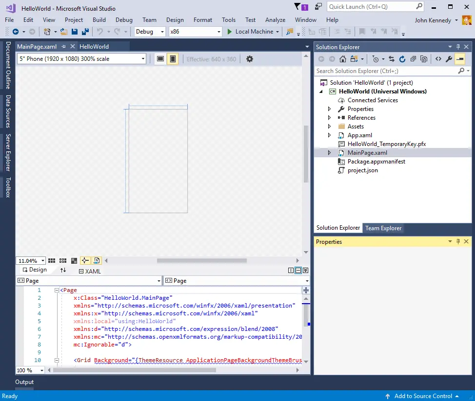 - 在设计视图中双击MainPage.xaml打开,你将发现图形视图位于屏幕顶部,而XAML代码视图位于底部。我们可以对任一视图进行更改,但现在使用图形视图。