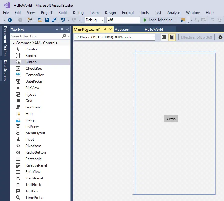 <Button x:name="button" Content="Button" HorizontalAlignment="Left" Margin = "152,293,0,0" VerticalAlignment="Top"/> - 更改按钮的文本:在XAML代码视图中单击一下,然后将内容从“Button”更改为“Hello World”。