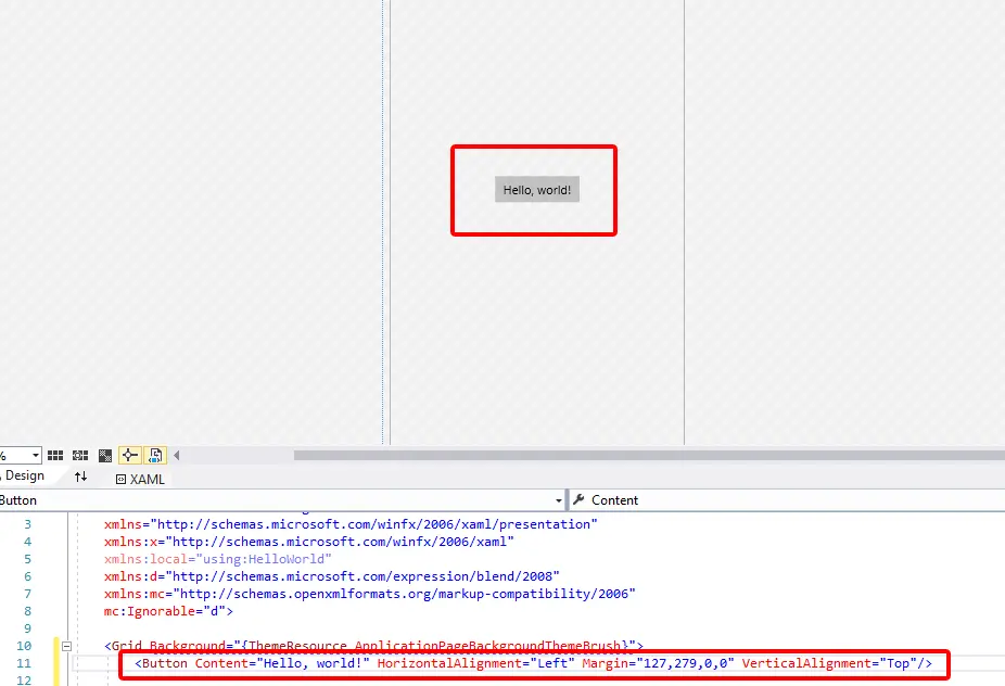 注意设计画布中显示的按钮如何更新显示新文本。<Button x:name="button" Content="Hello, world!" HorizontalAlignment="Left" Margin = "152,293,0,0" VerticalAlignment="Top"/>