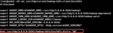 通过后续的分析得知,当执行hdfs等hadoop所属的命令后,会先执行/usr/bin/hdfs,而这个可执行程序是个链接,链接到/usr/hdp/current/hadoop-hdfs-client/bin/hdfs文件。我们通过查看该文件,最终发现会执行红框内的代码,我们继续追踪如下: