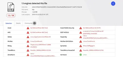 将其md5值放入VirusTotal查询,发现有13家报毒,是一款挖矿软件。