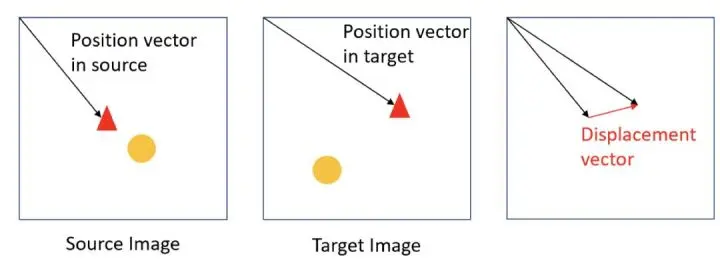 计算损失 : 作者使用了一种基于偏移向量的方法计算损失函数,见图 5。源图片中的关键点(第一张图,三角形点)在目标图片中的对应点(第二张图,三角形点)的位置。它们之间的偏移量,就是偏移向量(第三张图,红色箭头)。