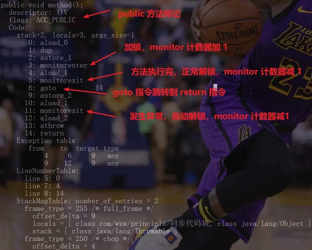 使用 javap -verbose SynchronizedCodeBlock.class 命令反编译结果如下图: