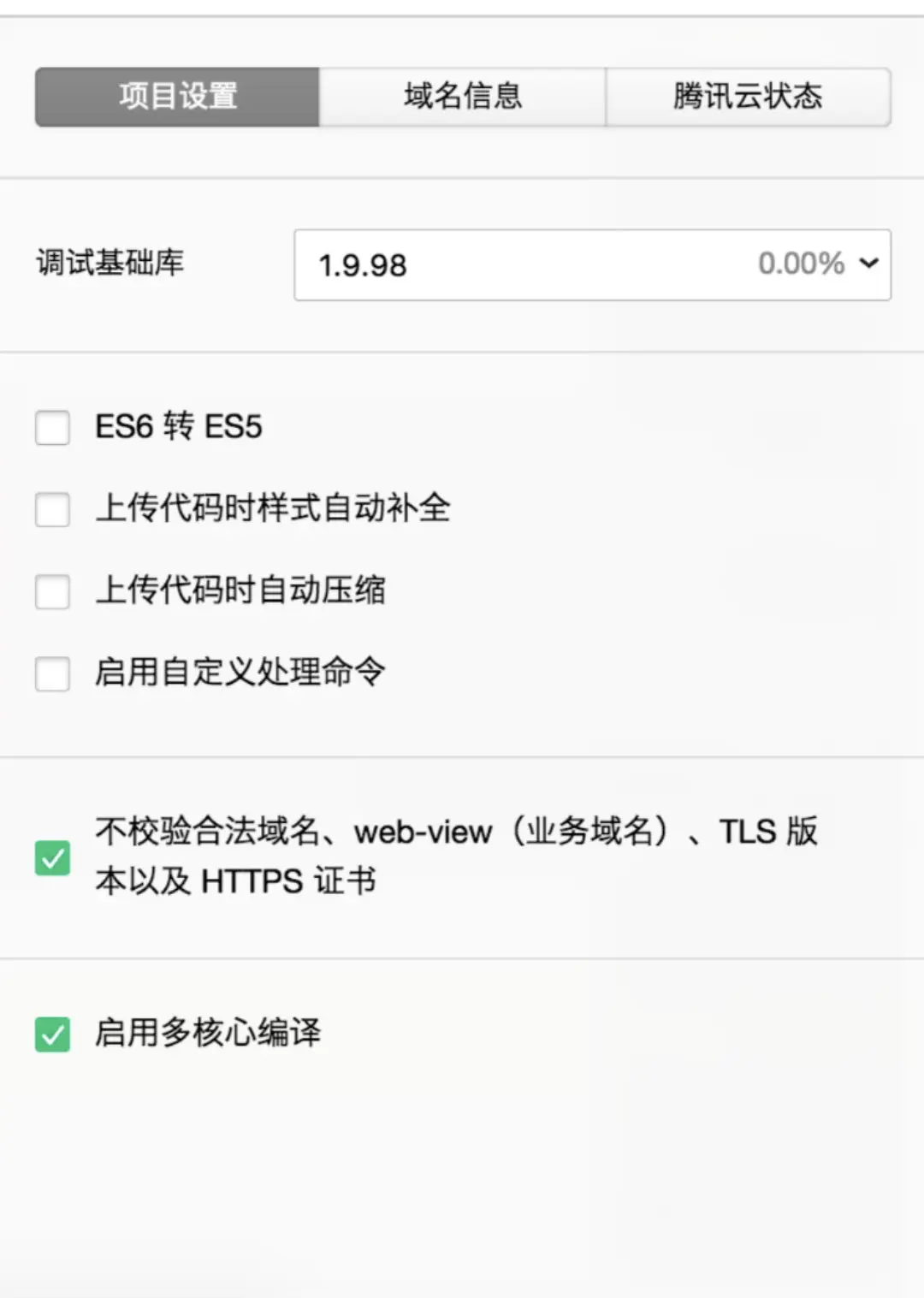 由於 Taro 編譯後的程式碼已經經過了轉義和壓縮,因此還需要注意微信開發者工具的專案設定