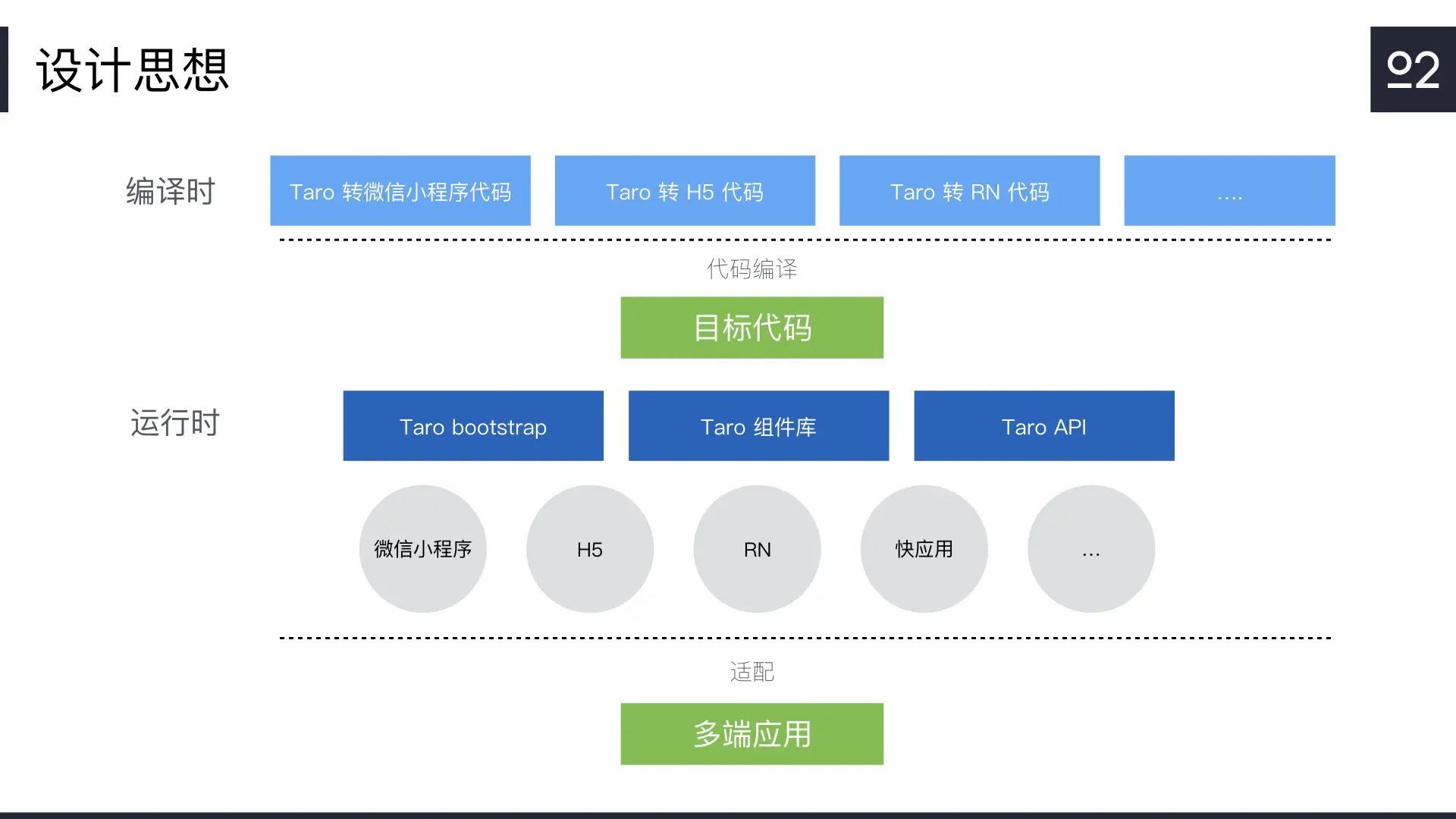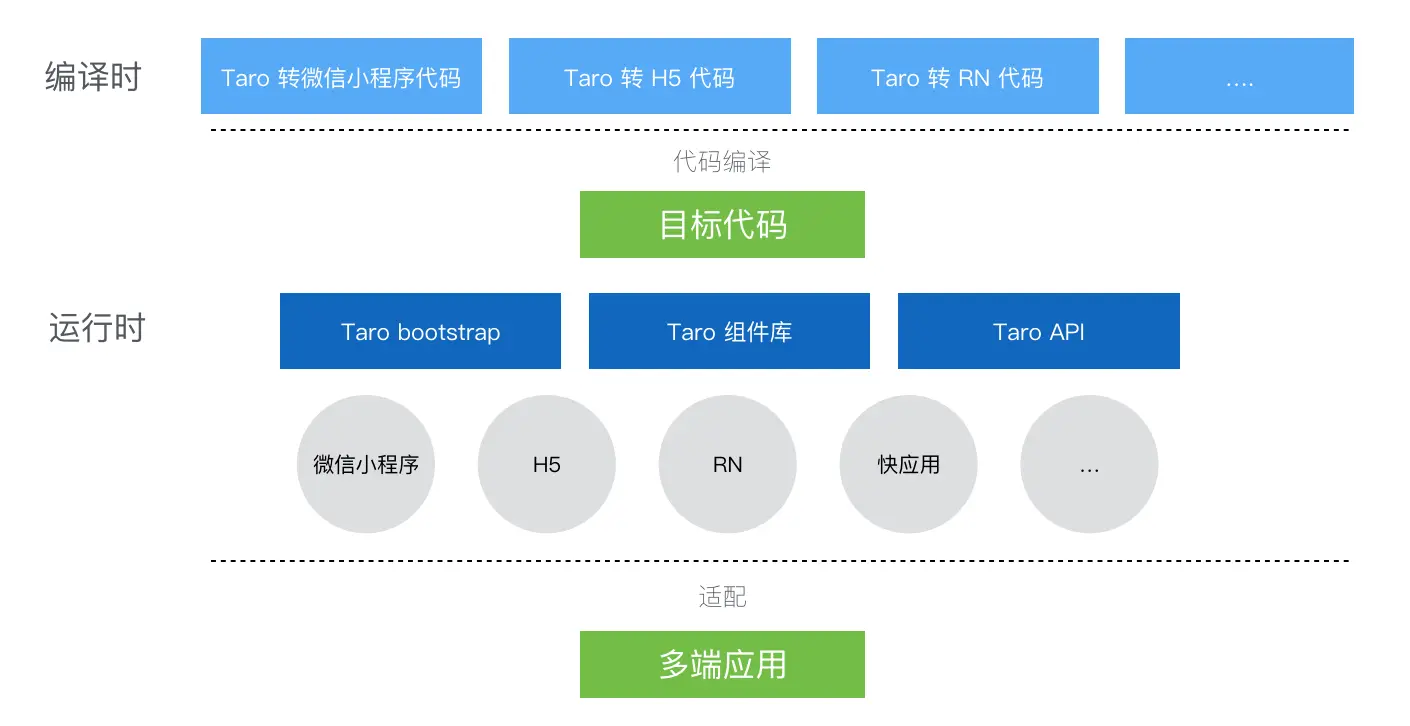 從某種角度上講,我們要做的事情和babel非常像。babel把基於新版 ECMAScript 規範的程式碼轉換為基於舊 ECMAScript 規範的程式碼,而Taro希望把基於React語法的程式碼轉換為小程式的語法。我們從babel受到了啟發:既然 babel 可以通過執行時框架來實現新特性,那我們也同樣可以通過執行時程式碼,實現上面這些 Web 開發中不存在的功能。