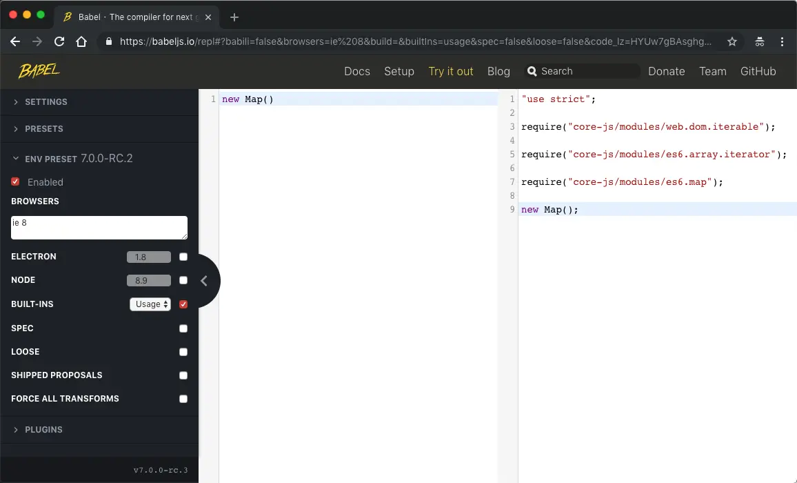 我們不妨去 babel 的 playground 看一看程式碼在轉譯前後的對比:在使用了 @babel/preset-env 的 BUILT-INS 之後,簡單的一句原始碼 new Map() ,在 babel 編譯後卻變成了好幾行程式碼…
