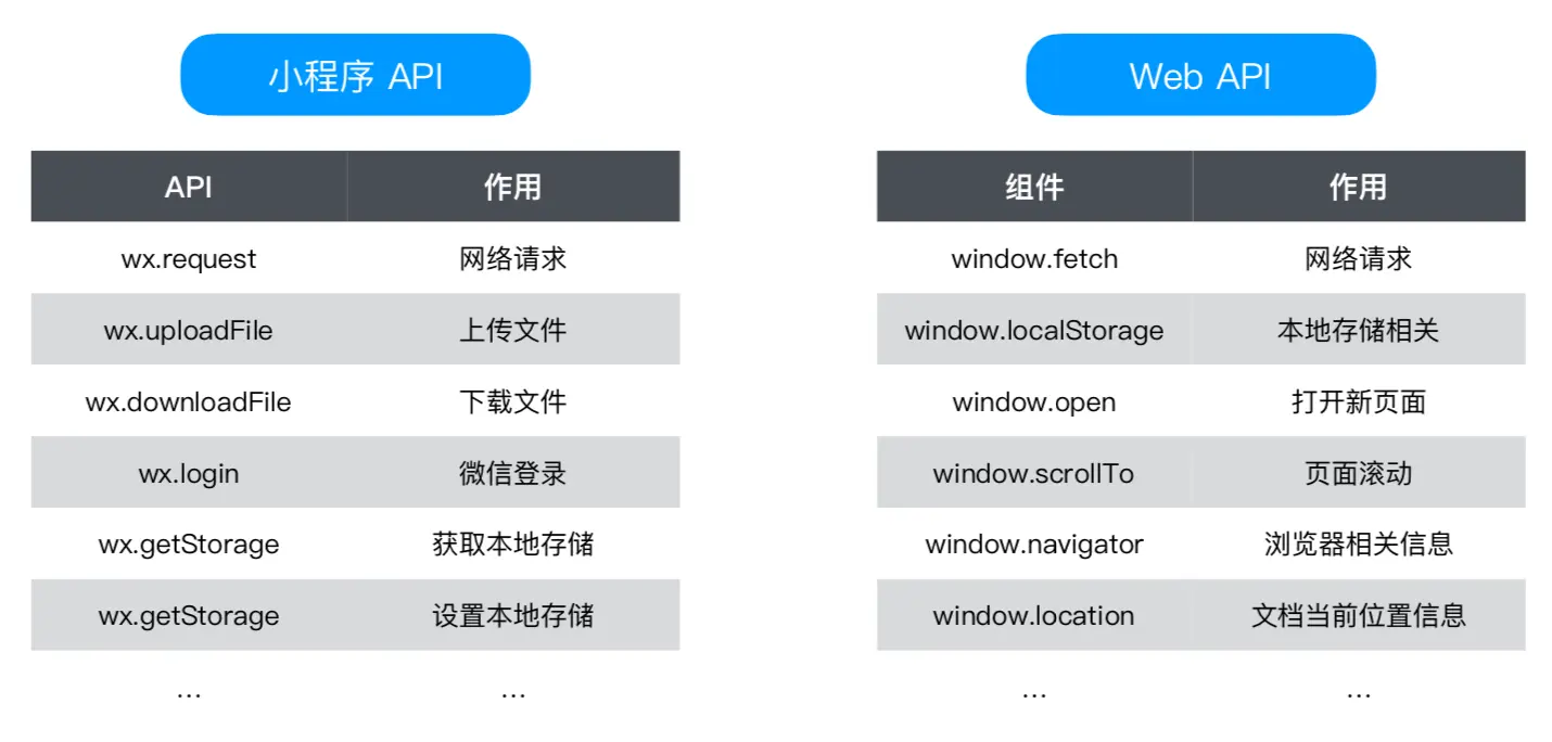 除了元件,小程式下有一些 API 也是 Web 開發中所不具備的。比如小程式框架內建的 wx.request/wx.getStorage 等 API;但在 Web 開發中,我們使用的是 fetch/localStorage 等內建的函式或者物件