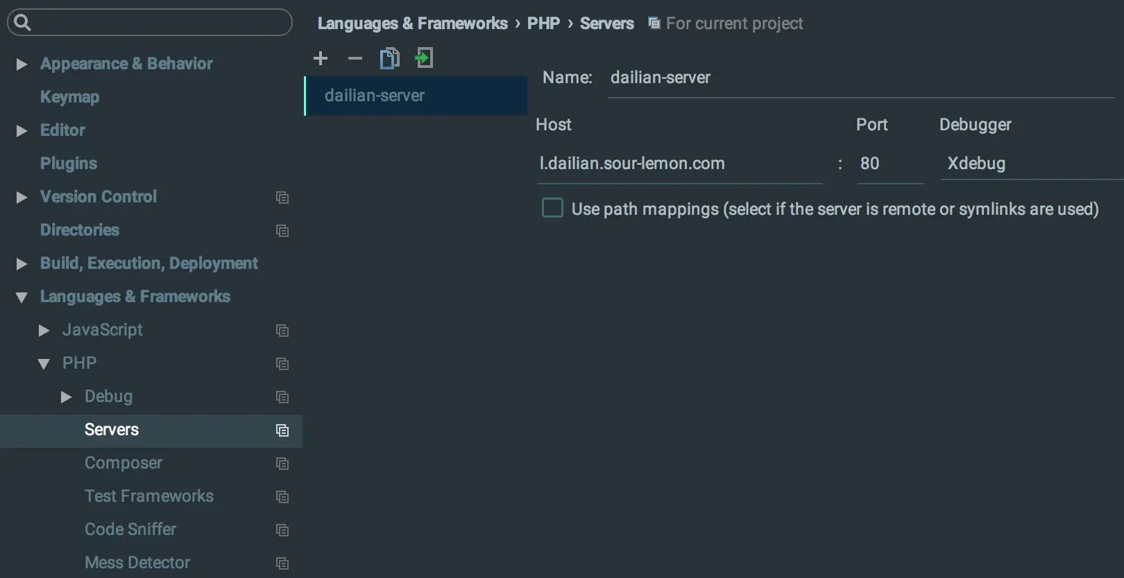 这里的另外一种方式的服务器配置方式和流程完全一致, 就是第四步和第五步有所不同, 实现的原理是在phpstorm中设置运行的服务器, 然后通过 debug 模式自动设置 XDEBUG_SESSION, 并且自动开启监听.