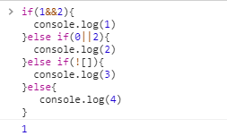 条件语句,逻辑与,逻辑或,和boolean值转换的题 小浣熊的姐姐小还熊 2019-01-04 287 阅读1分钟 if(1&&2){ console.log(1) }else if(0||2){ console.log(2) }else if(![]){ console.log(3) }else{ console.log(4) }