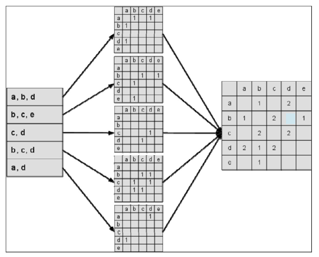 上图是一个根据上面的程序计算物品相似度的简单例子。图中最左边是输入的用户行为记录,每一行代表一个用户感兴趣的物品集合。然后,对于每个物品集合,我们将里面的物品两两加一,得到一个矩阵。最终将这些矩阵相加得到上面的矩阵。其中
