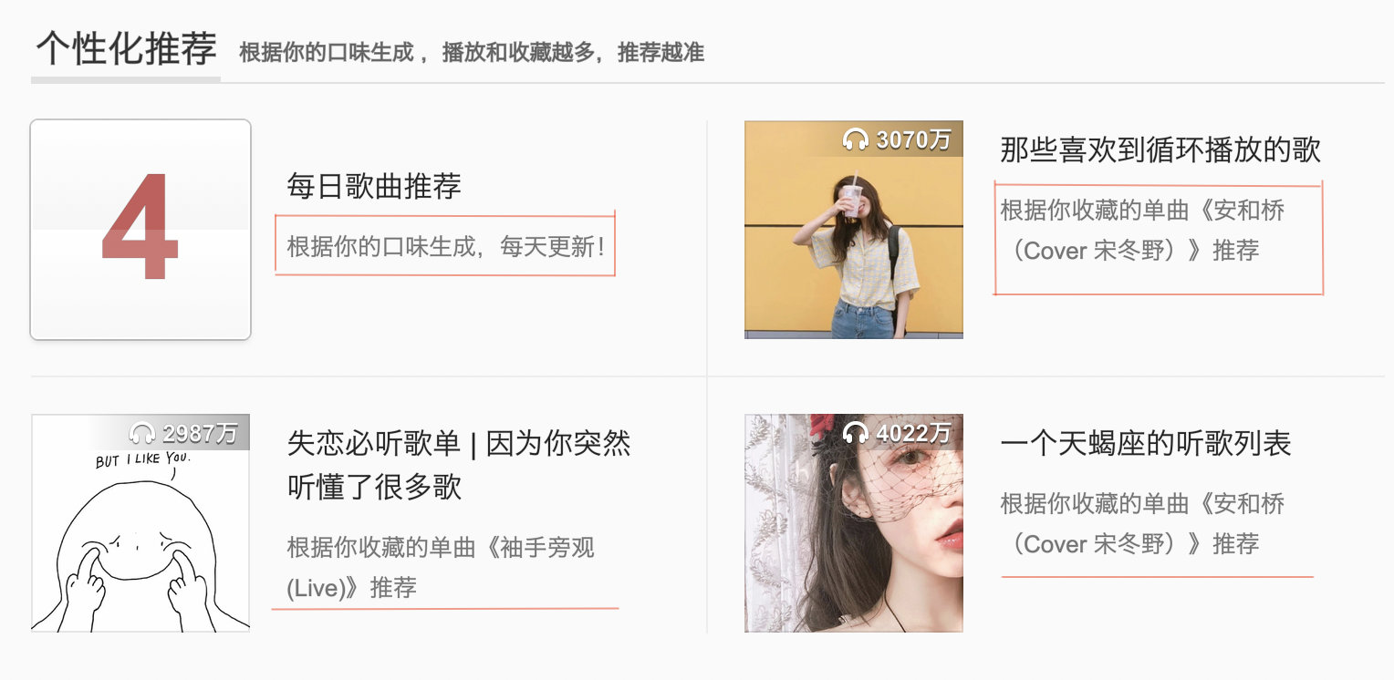 看了上述的标记,是不是瞬间理解了为啥用网易云听音乐的时候会有上瘾的感觉,因为他给你听的都是你爱听的啊。就跟小时候我妈给我做菜是一样的,今天知道我喜欢吃红烧肉,明天为了照顾我的喜好又为了保证不重样,第二天就给我做了糖醋排骨,久而久之产生了依赖性,体重也开始飙升了。