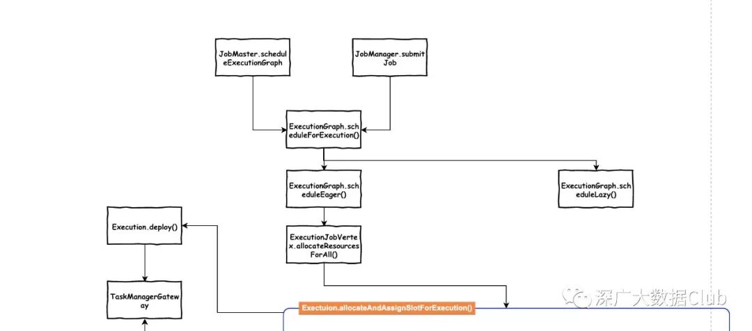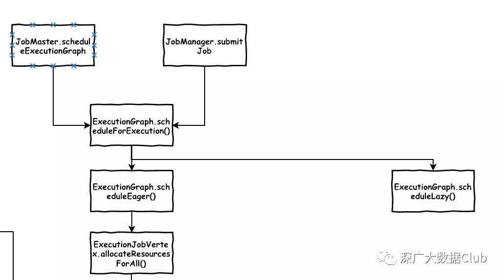 总的流程入口是在ExecutionGraph.scheduleForExecution()方法。从上图可以看出调用该方法的地方有两处: