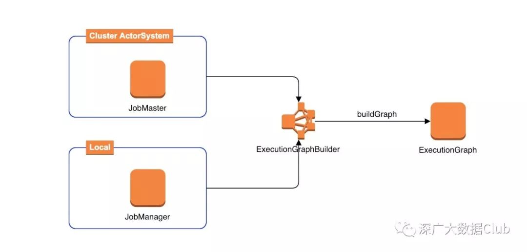 其实上述所讲述的JobManager形式是属于集群模式的提交方式。在本地调用过程中,与ExecutionGraphBuilder的交互并不是JobManager,而是JobMaster。但ExecutionGraph的生成过程是一致的。
