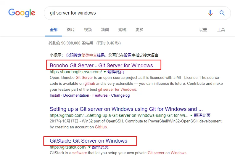 本人习惯使用 git bash 提交代码,不过最近觉得 git gui 要更方便一些。这里还是先介绍一下如何使用 git bash 将本地仓库推送至 GitHub。很多小伙伴不喜欢思考,抱怨说 "我想学的是 Git,你为啥老拿 GitHub 举例?",其实推送到哪儿无所谓,喜欢折腾的话,自己搭一个局域网 Git 服务器也可以,以下是 Google 搜索结果: