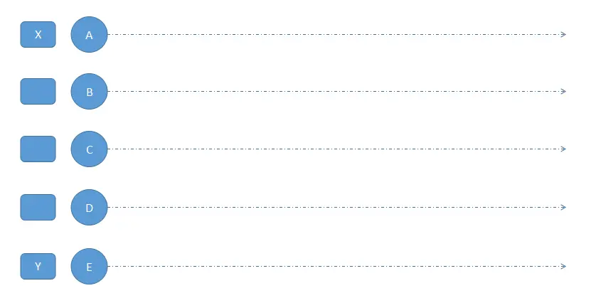 假设现在有五个节点的分布式系统,此时 A 节点打算提议 X 值,E 节点打算提议 Y 值,其他节点没有提议。