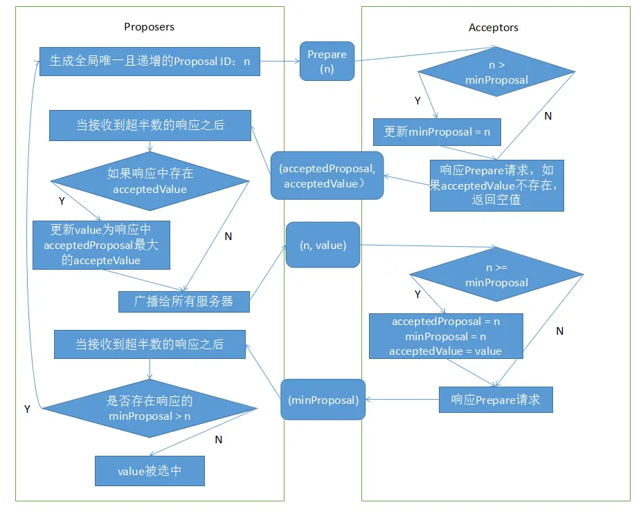 - 接受者(Acceptor):接受者可以对倡议者提出的提议进行投票表决,提议有超半数的接受者投票即被选中