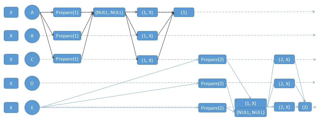 此时 E 节点选择 Proposal ID 为 2 发送 Prepare 请求,结果就和上面不一样了,因为 C 节点已经接受了 A 节点的提议,它不会三心二意,所以就告诉 E 节点它的选择,E 节点也很绅士,既然 C 选择了 A 的提议,那我也选它吧。于是,E 发起 Accept 请求,使用 X 作为提议值,至此,整个分布式系统达成了一致,大家都选择了 X。