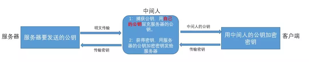 服务器以明文的方式给客户端传输公钥的时候,中间人截取了这把属于服务器的公钥,并且把中间人自己的公钥冒充服务器的公钥传输给了客户端。