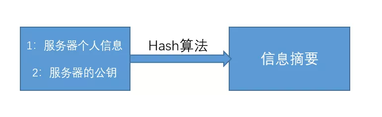服务器在给客户端传输公钥的过程中,会把公钥以及服务器的个人信息通过Hash算法生成信息摘要。如图