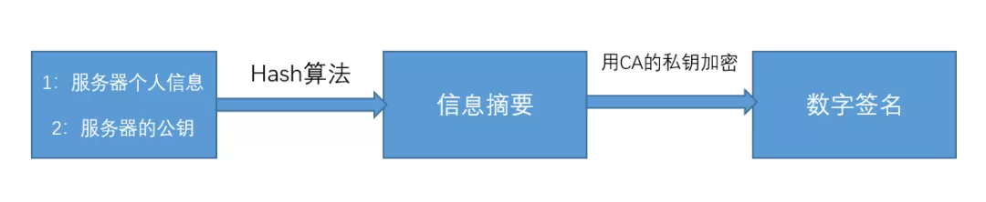 为了防止信息摘要被人调换,服务器还会用CA提供的私钥对信息摘要进行加密来形成数字签名。如图: