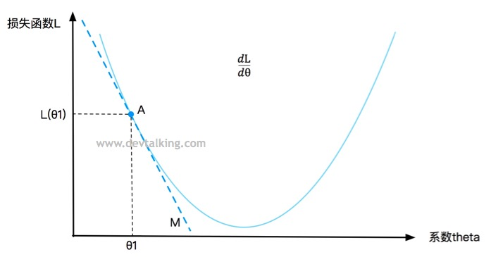 θ" role="presentation">值,一个损失函数L的值,要判断点A是否是损失函数L的最小值,既求该点的导数,在第一篇笔记中我解释过,点A的导数就是直线M的斜率,直线M是点A的切线,所以导数描述了一个函数在某一点附近的变化率,并且导数大于零时,函数在区间内单调递增,导数小于零时函数在区间内单调递减。所以