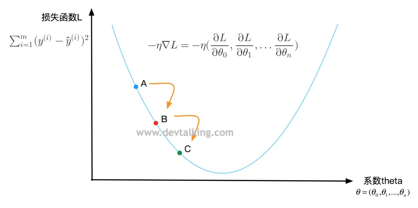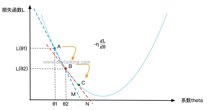 同理还可以再求得点C,然后看是否是损失函数的L的最小值。所以梯度下降法就是基于损失函数在某一点的变化率