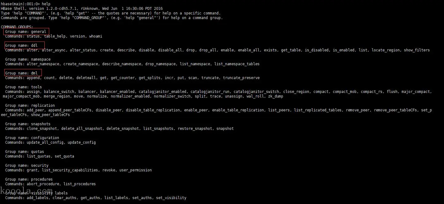 Hbase Shell 中运行 help 命令可以看到有哪些命令可以使用。这些命令按照功能范围被分成了很多组(Command Groups),每组都包含了若干个命令。本文我选取几个日常工作中常用的命令来进行介绍(对其他命令感兴趣的朋友,可以逐个百度或者 google 进行了解),这些命令主要分布在 general(通用)、ddl(data manipulation language:数据操作语言)、dml(data definition language:数据定义语言) 这些分组中。