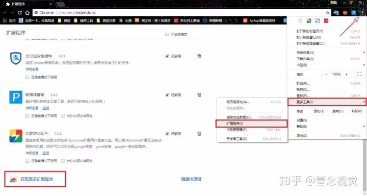 只需要在谷歌浏览器右上角菜单下选择【更多工具】-【扩展程序】,然后在网页最下方点击【获取更多扩展程序】便可进入谷歌的插件商店,来下载丰富的插件资源。