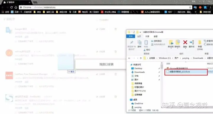 2)进入 Google 浏览器扩展程序(前面有提及如何进入),将本地下载好的 .crx 文件拖入网页。