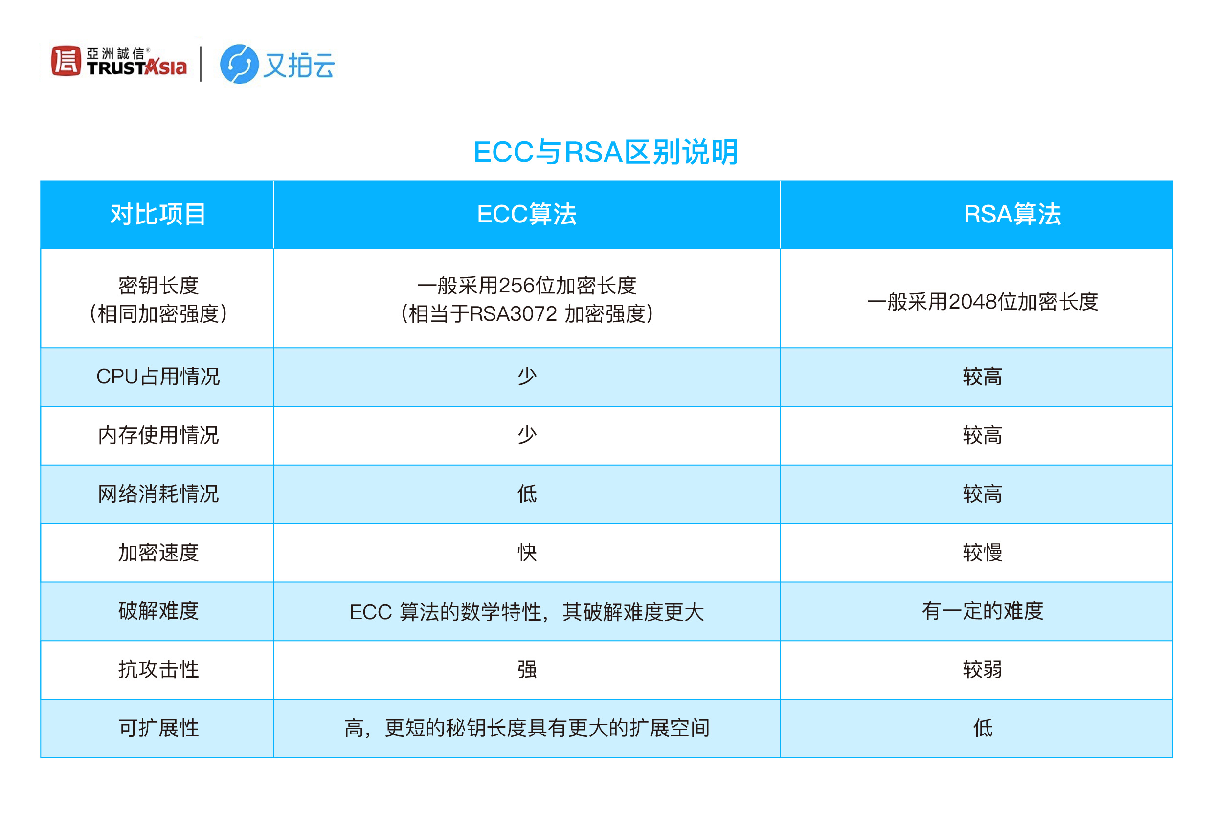 ECC算法:中文名称为椭圆加密算法,新一代算法趋势主流,一般采用256位加密长度,对服务器资源消耗低,效率更高。