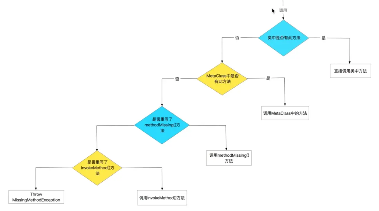 在java中,如果对象调用了一个类中没有定义过的方法时,连编译都编译不过,但是在groovy中,情况则不同(可以编译通过),根据图中流程可以知道,运行期间,当对象调用了一个类中没有的方法时,会依次调用metaClass中的同名方法,类中的methodMissing(String name, Object args)方法,类中的invokeMethod(String name, Object args)方法,执行到其中一个便停止后续方法查找调用。