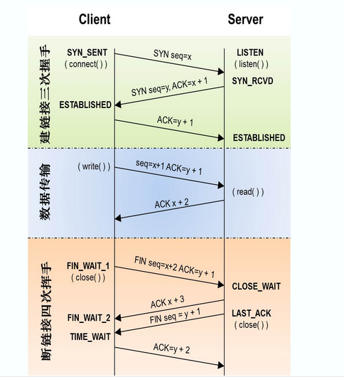 四次挥手:客户端调用close时,向服务器发送请求,服务器回应请求同时解堵塞,调用自己close后,再次向客户端发送close请求,此时客户端方会等待两个最大报文时间,等待接收服务器的请求(等待是为了避免断网,断电等特殊情况),收到服务器的请求后,向服务器回应请求,服务器收到请求后关闭,4次挥手成功,双方关闭连接