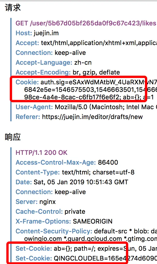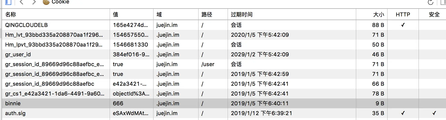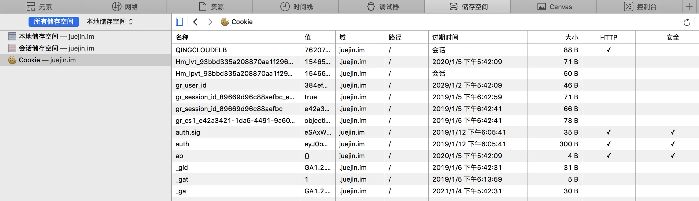 审查以下掘金的页面,可以看到掘金存储的cookie,cookie一般存于用户内存&硬盘里面。