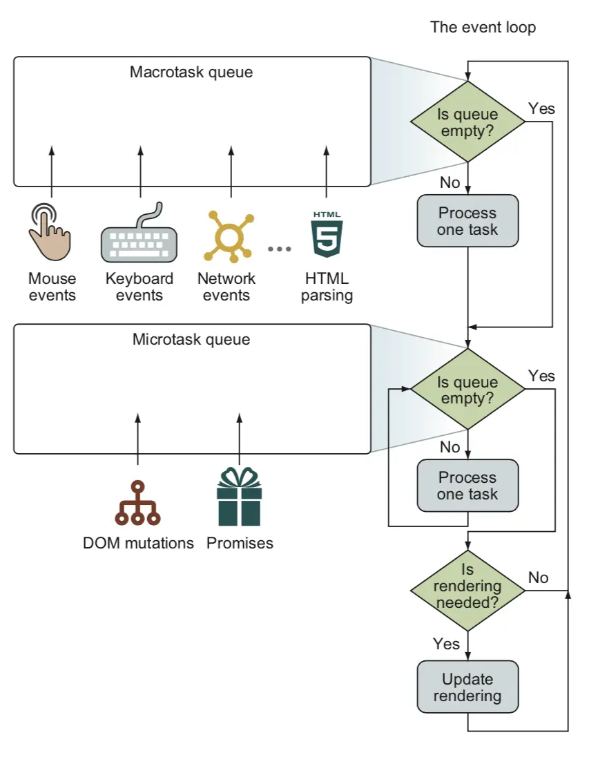event loop 里面有维护了两个不同的异步任务队列 macroTasks(Tasks) 的队列 microTasks 的队列