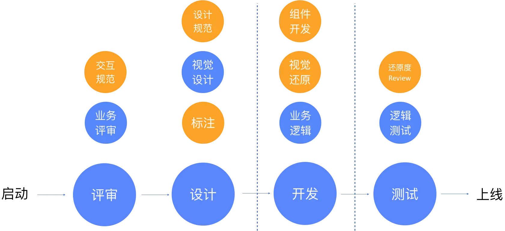 一般一个项目的上线流程基本都要经历,评审、设计、开发、测试 这几个阶段。