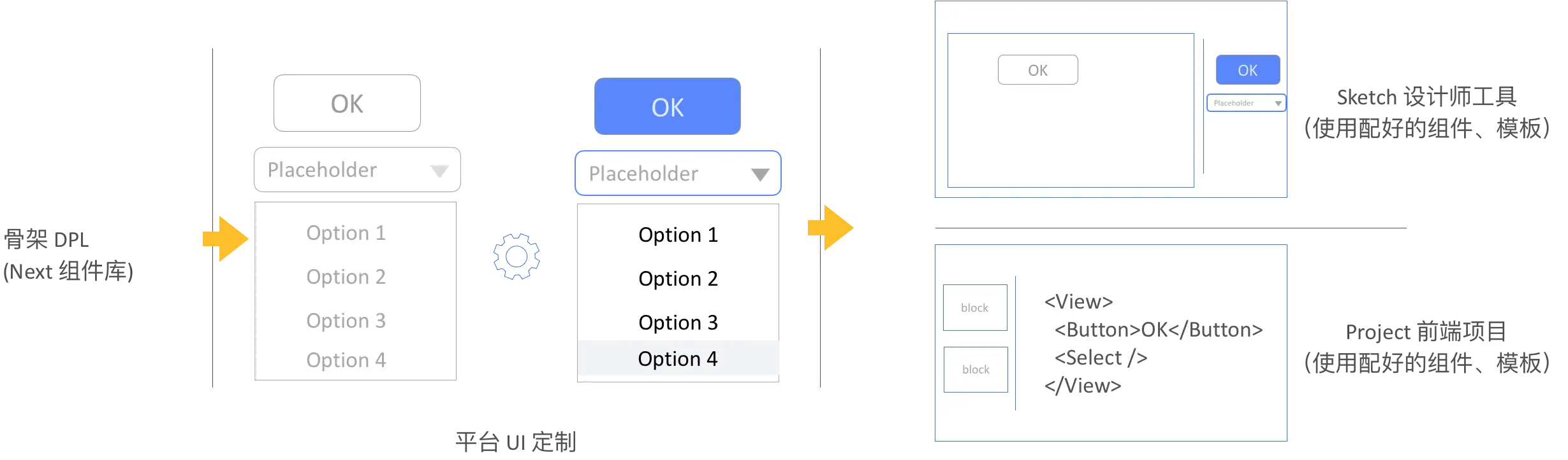 通过抽象骨架 DPL -> 通过平台定制产出定制好UI的组件、模板 -> 流入设计师的工具里面直接拖拽使用 -> 前端直接使用定制好的组件(不需关注组件UI)