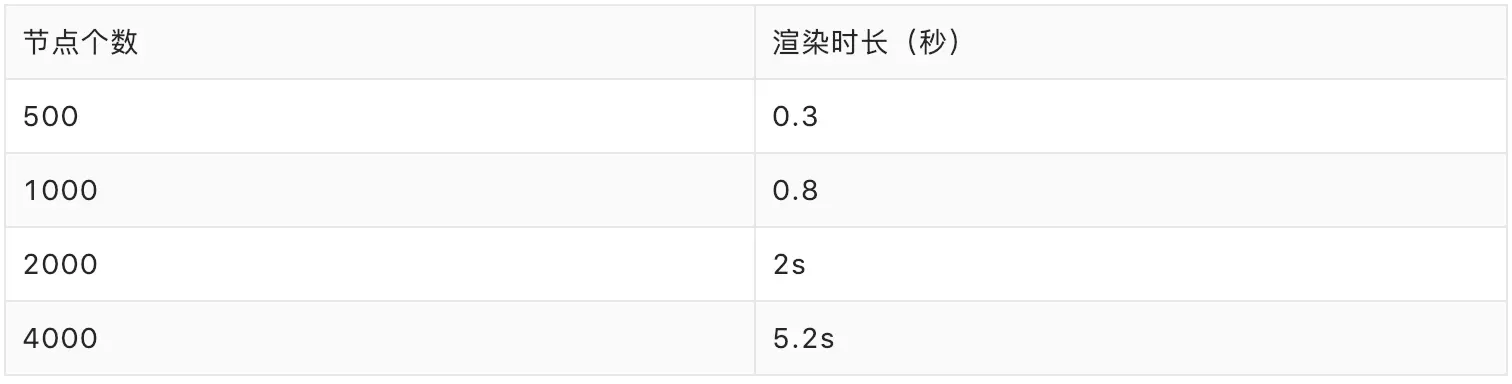 另外针对中后台表单大数据量场景做了大量性能优化,比如普通 table 随着数据不断增长 render 会越来越慢,大致如下:
