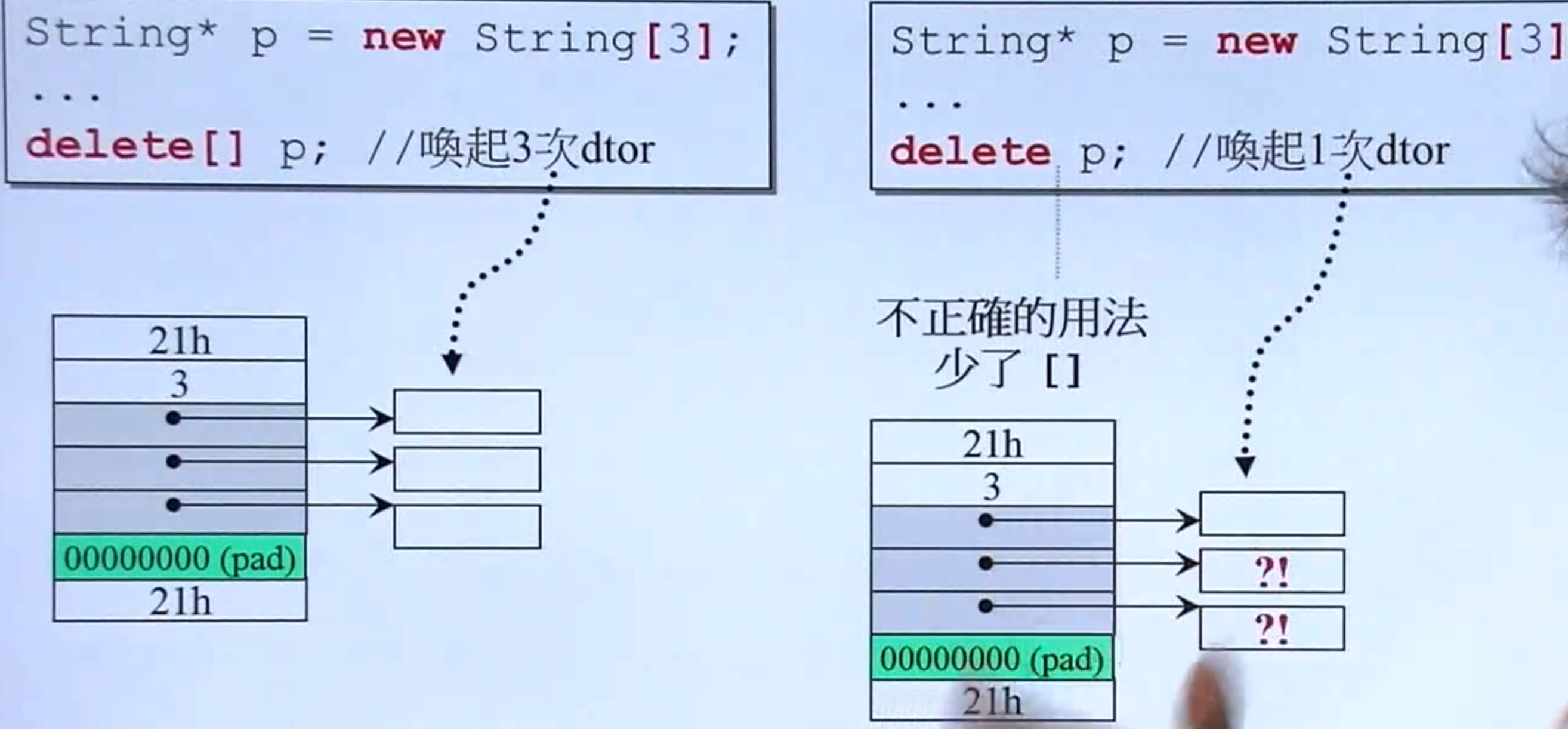 delete[] p才会在释放动态内存后,正确的调用三次析构函数- 如上图,如果不是