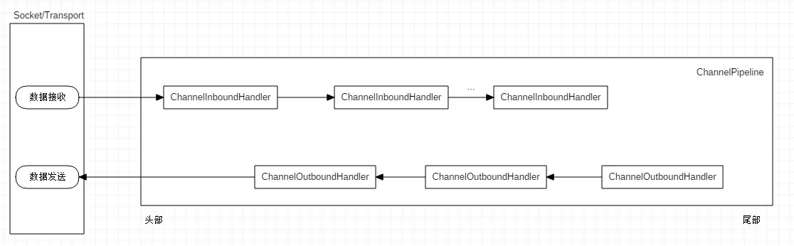ChannelPipeline:ChannelHandler链的容器。ChannelPipeline就是一些ChannelHandler的编排顺序,每个ChannelHandler接收事件,执行所实现的处理逻辑,完毕后交给下个一个ChannelHandler。- 从客户端角度来说,发送数据到服务器就是出站的。则通过