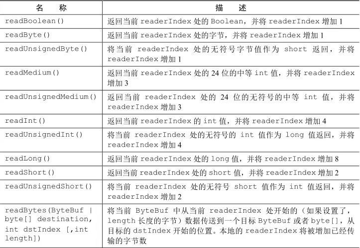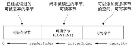 ByteBuf的可读字节分段(CONTENT)存储了实际数据。任何名称以 read 或者 skip 开头的操作都将检索或者跳过位于当前readerIndex的数据,并且将它增加已读字节数。 - 可写字节 可写字节分段是指一个拥有未定义内容的、写入就绪的内存区域。