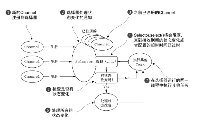 Channel在选择器(Selector)上注册,当Selector调用select()的时候是阻塞的,直到已经注册的Channel中有相应的事件发生。